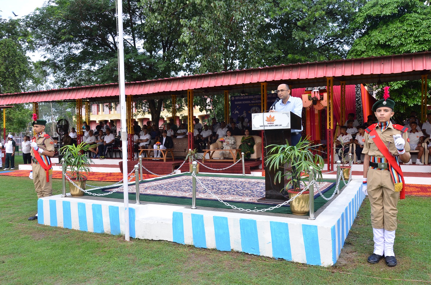 The North Zone Inter Sainik Schools Sports & Cultural Meet – 2022 got off to a flying start at Maj Somnath Sharma (PVC) Stadium in Sainik School Nagrota on 11 July 2022. Following a crisp and colourful March Past by the cadets belonging to eight contingents from Sainik Schools of Uttrakhand, Haryana, Punjab, Himachal Pradesh, Uttar Pradesh and Jammu & Kashmir. Mr Bhupinder Kumar IAS, Transport Commissioner, J&K, an alumnus of the School, who was the Chief Guest on this occasion, formally declared the Meet open amidst euphoria and jubilation. Ms Ankita Kar, IRAS, Additional Commissioner, State Taxes Dept. graced the occasion as the Guest of Honour.