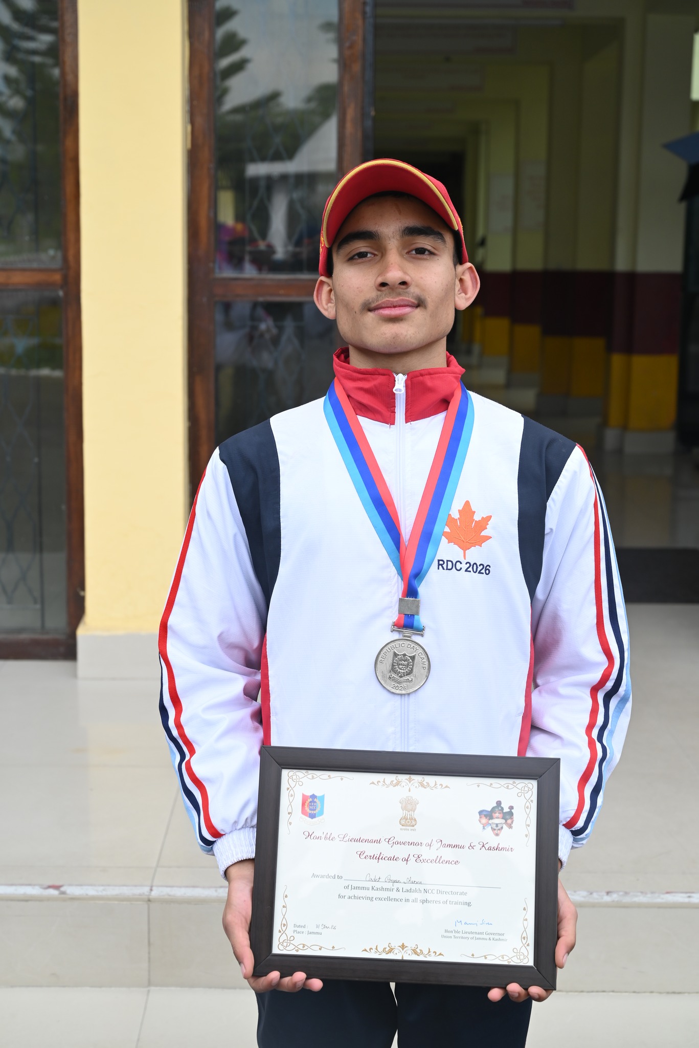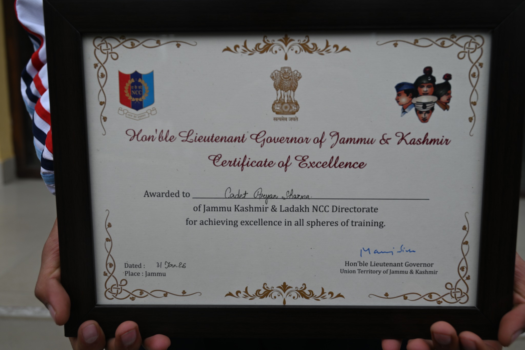 Cadet Aryan Sharma of 01 J&K Naval NCC, Srinagar was adjudged Best Cadet (JD Naval) from Jammu & Kashmir and was awarded the Governor’s Certificate of Excellence for his exemplary all-round performance.